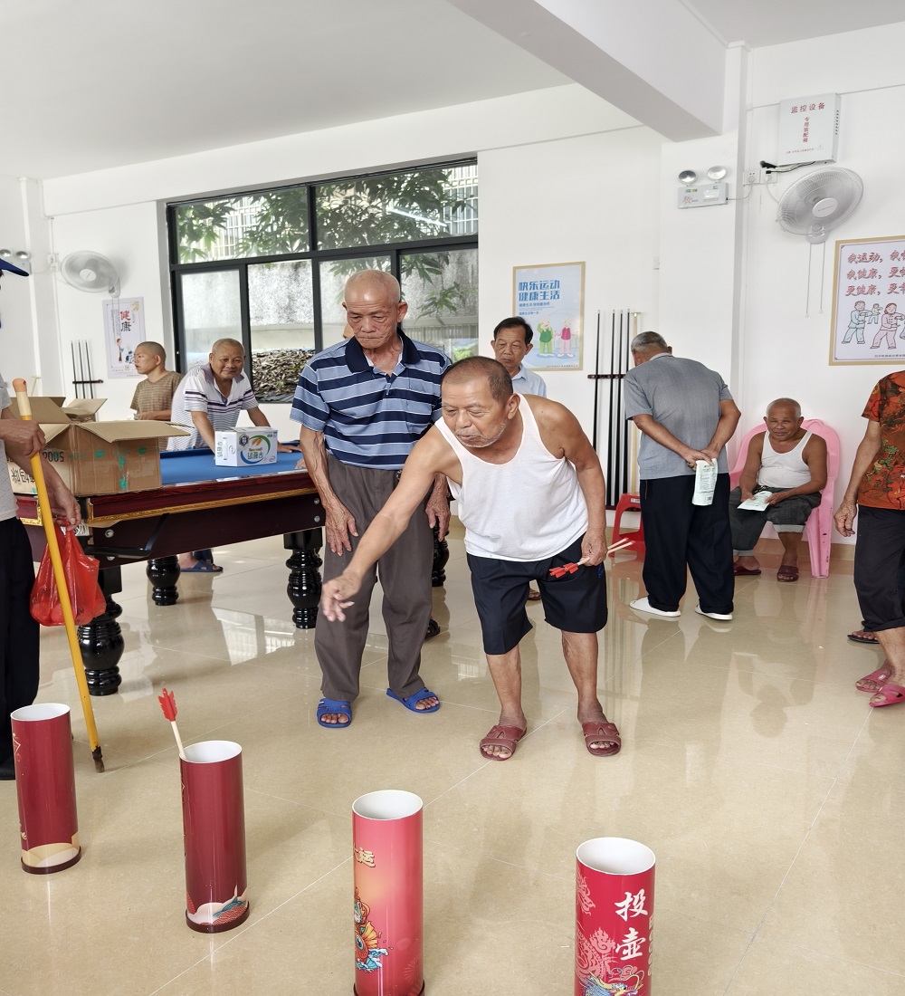 为了让这个端午节更加难忘,志愿者服务队还精心策划了一系列趣味盎然的互动游戏。在“套圈圈”游戏中,老人们手握彩色圈圈,瞄准摆放着小礼品的立柱,每套中一次便引来一阵欢笑和掌声;“投壶”环节,老少同乐,展现了传统游戏的魅力,参与者们屏息凝神,每一次精准的投掷都让现场气氛高涨;而“夹珠子”比赛,则考验着大家的手眼协调能力,在轻松愉快的氛围中,老人们展现出了不凡的技巧,赢得了阵阵喝彩;“抽奖滚滚乐”游戏最受老人们的欢迎,每一次的参与都有不一样的惊喜。