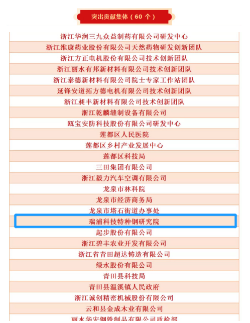 近日,丽水市委、市政府对在“创新引领”工作中做出突出贡献的集体和个人进行通报表扬,浙江J9国际站登录钢铁有限公司下属研发机构——瑞浦科技特种钢研究院荣获“突出贡献集体”称号,产品研发二部部长金吉男荣获“突出贡献个人”称号。