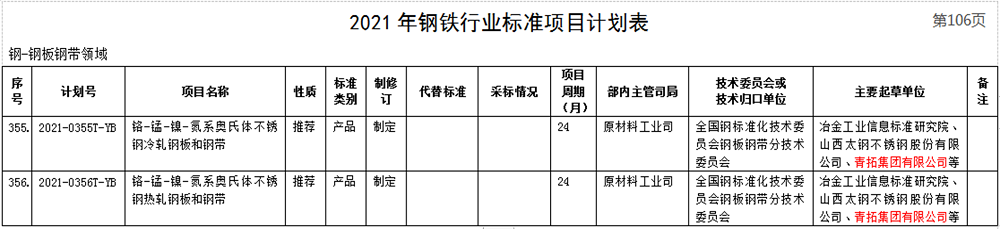 3月2日,工业和信息化部批准了2021年第一批行业标准制修订计划。其中青拓集团有限公司牵头或参与了2021-0121T-YB《装饰用不锈钢冷轧钢板和钢带》、2021-0355T-YB《铬-锰-镍-氮系奥氏体不锈钢热轧钢板和钢带》和2021-0356T-YB《铬-锰-镍-氮系奥氏体不锈钢冷轧钢板和钢带》等三个行业标准,标准中涵盖了QN系五大产品。