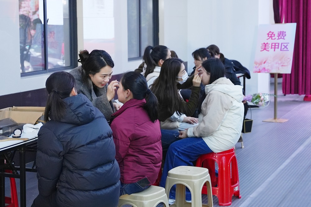 活动现场特设免费美甲、修眉、皮肤检测专区,为女员工送上贴心关怀。美甲台前,指尖点缀缤纷色彩;修眉区里,眉梢勾勒精致弧度;皮肤检测仪旁,专业分析传递科学护肤理念。最吸睛的当属“簪花留影”专区——女员工们头戴簪花,在镜头前展现风采。