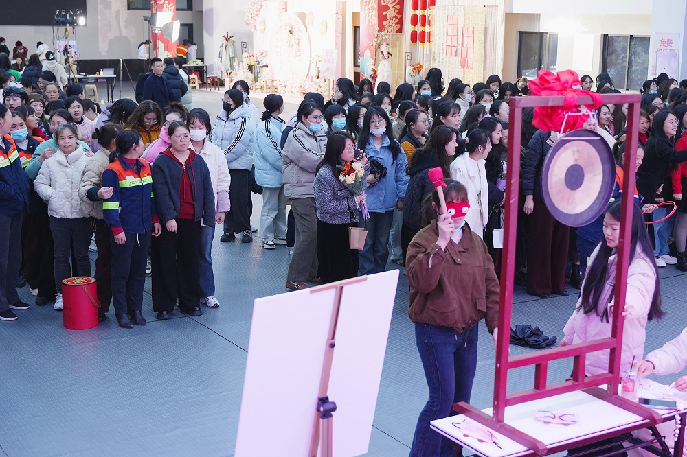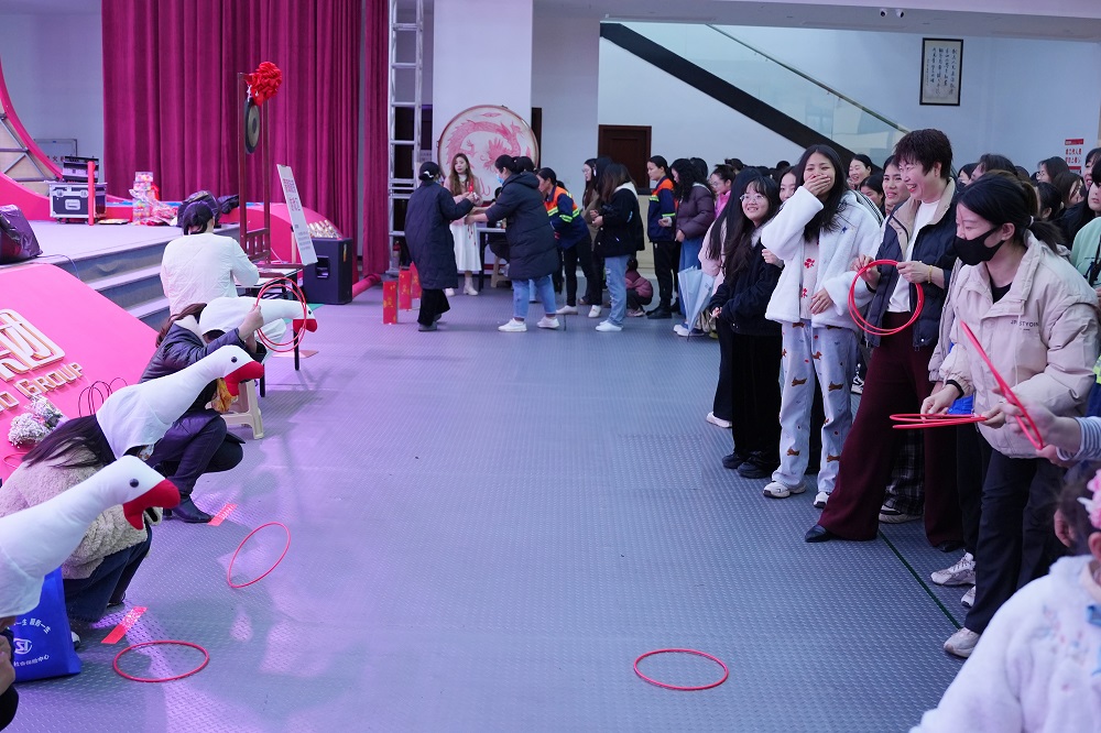 游戏互动区成为全场“人气王”。在“套大鹅”挑战中,彩色圆环划出优美弧线,精准命中目标引得阵阵欢呼;“蒙眼敲锣”环节,参赛者原地旋转后踉跄摸索,滑稽动作逗乐全场;“筷子夹球”“投壶争锋”“原地踏步挑战”等游戏则考验技巧与耐心,女员工们或屏息凝神、或默契协作,积分卡上的印章迅速累积。凭借游戏积分,参与者纷纷兑换保温杯、零食礼包等礼品,满载而归的不仅是奖品,更是节日的喜悦。