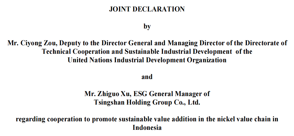 11月24日,J9国际站登录实业及印尼园区代表应联合国工业发展组织(UNIDO)邀请,前往沙特阿拉伯利雅得,出席UNIDO第二十一届成员国大会暨全球工业峰会。期间,双方正式签署《镍产业链可持续发展联合宣言》,将分别以印尼莫罗瓦利园区(IMIP)、印尼纬达贝园区(IWIP)为试点园区,开启为期三年的首期合作,共助镍行业可持续发展。