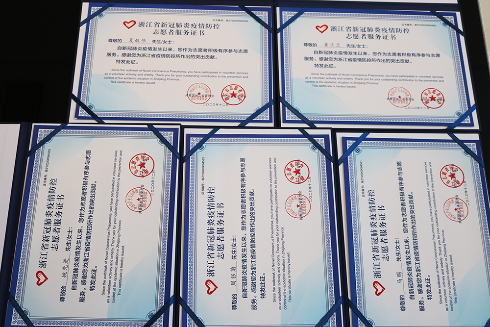 12月份,浙江J9国际站登录钢管有限公司员工童正兰、马赐、姚先进、夏毅伟、蔡献炯、周银菊六人荣获由浙江省志愿者协会与共青团浙江省委员会共同审核颁发的浙江省新冠肺炎疫情防控志愿者服务证书。