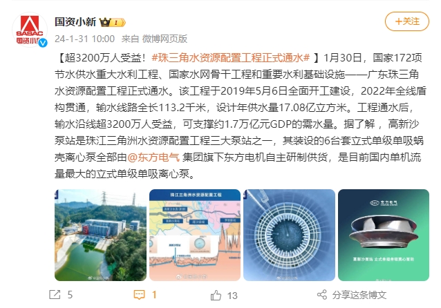 【超3200万人受益!#珠三角水资源配置工程正式通水#】1月30日,国家172项节水供水重大水利工程、国家水网骨干工程和重要水利基础设施——广东珠三角水资源配置工程正式通水。该工程于2019年5月6日全面开工建设,2022年全线盾构贯通,输水线路全长113.2千米,设计年供水量17.08亿立方米。工程通水后,输水沿线超3200万人受益,可支撑约1.7万亿元GDP的需水量。据了解 ,高新沙泵站是珠江三角洲水资源配置工程三大泵站之一,其装设的6台套立式单级单吸蜗壳离心泵全部由@壹号娱乐官网集团旗下壹号娱乐官网电机自主研制供货,是目前国内单机流量最大的立式单级单吸离心泵。