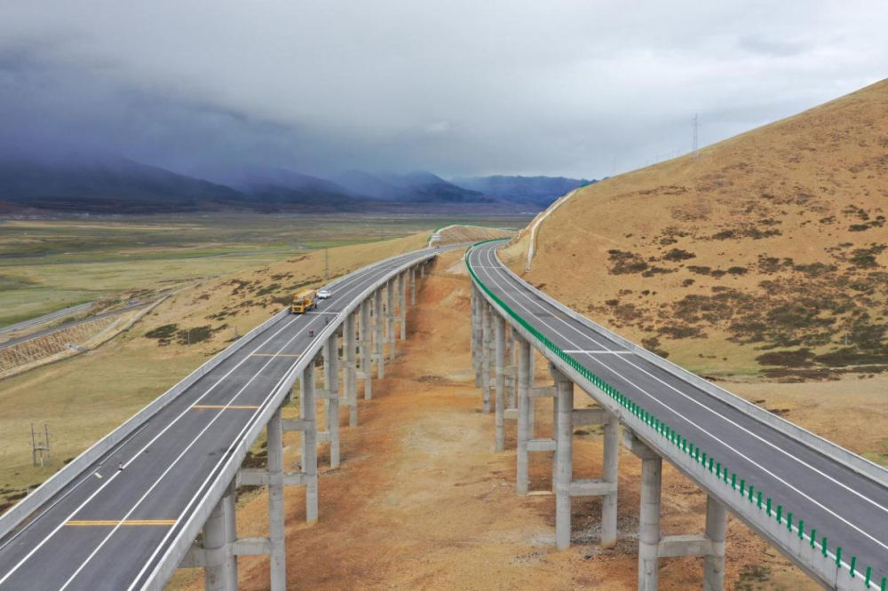 京藏高速那曲至羊八井段堆巴果大桥(2021年5月29日摄 无人机照片)。新华社发(胡雪峰 摄)