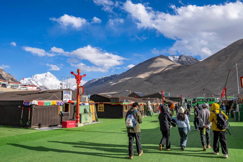 2024年5月24日,游客行走在珠峰游客大本营。目前,珠穆朗玛国家公园已进入旅游旺季。新华社记者 孙非 摄