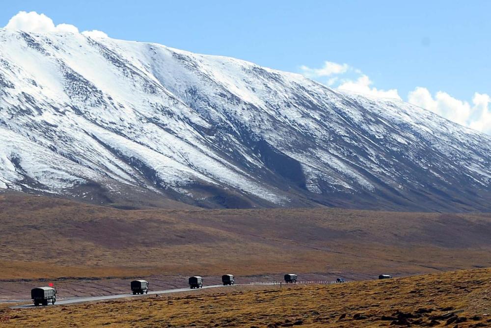 2014年9月27日,一个车队行驶在通往唐古拉山口的途中。青藏公路像一条洁白的哈达,横亘在平均海拔4000米以上的青藏高原。新华社记者 王颂 摄