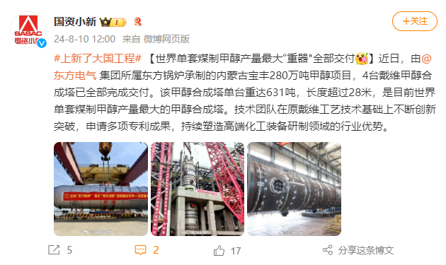 [国资小新]#上新了大国工程# 【世界单套煤制甲醇产量最大“重器"全部交付】
