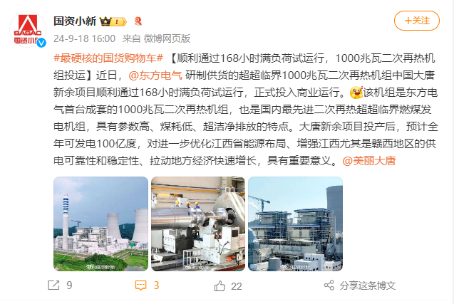 [国资小新]#最硬核的国货购物车# 【顺利通过168小时满负荷试运行,1000兆瓦二次再热机组投运】