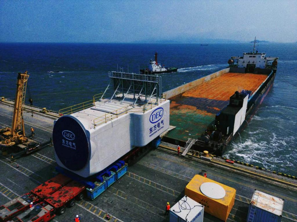 超500吨的机舱远超港口常规起重能力。团队提出“精准潮位+高精度滚装”方案,机舱滚装必须与潮汐展开“赛跑”,团队成员彻夜坚守港口,锁定凌晨高平潮仅有的2小时窗口,以低于0.5千米/小时的速度沿特制跳板移动,并借助波浪传感器和动态平衡系统,在潮水涨落的瞬息之间实现安全“登陆”,攻克了超重型机舱港口装卸作业行业技术难题。
