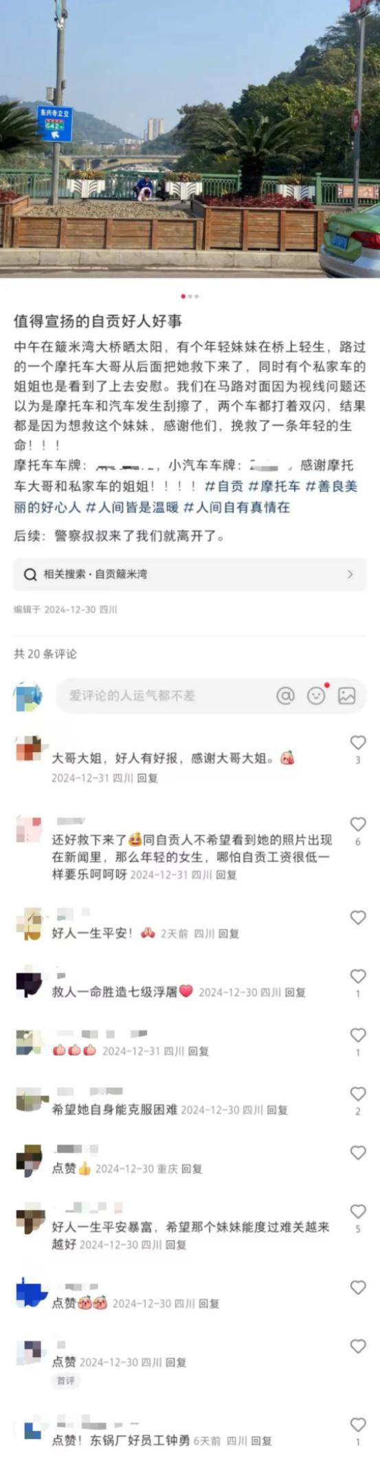 近日,在四川自贡簸米湾大桥上上演了暖心一幕:一位“摩托车大哥”挽救了一名意欲轻生的女孩。这一见义勇为的善举被路人用镜头捕捉了下来。