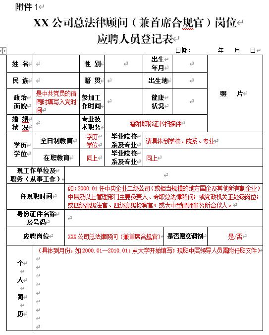XX公司总法律顾问(兼首席合规官)岗位应聘人员登记表