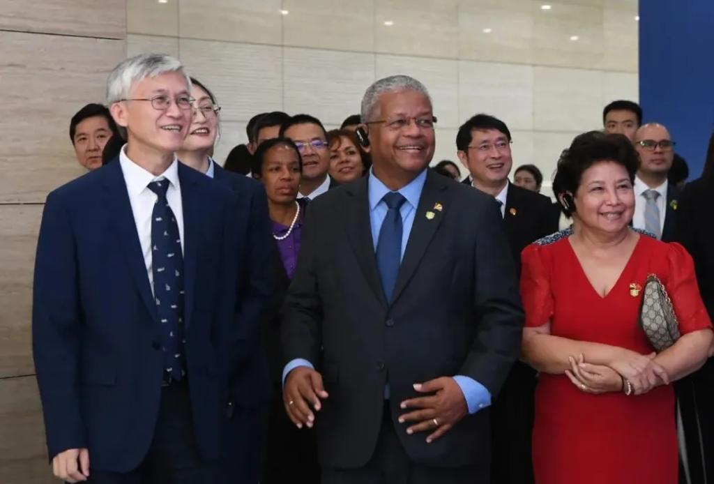 本网讯 9月6日,塞舌尔总统拉姆卡拉旺及夫人一行到壹号娱乐官网集团参观考察,受到集团公司总经理、党组副书记张彦军的热情接待。中国驻塞舌尔大使林楠陪同考察。股份公司副总裁李建华参加接待。