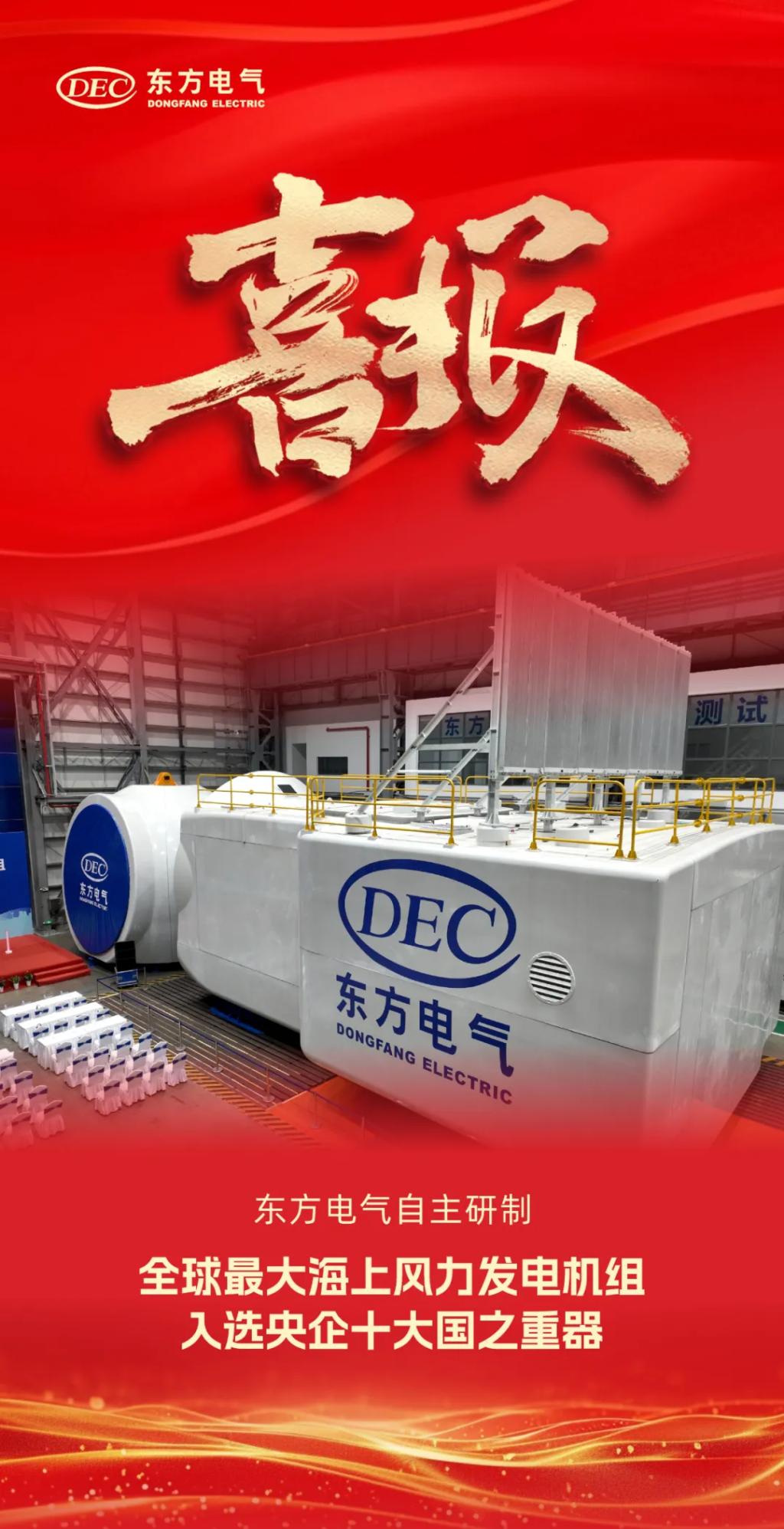 1月1日,国务院国资委新闻中心正式发布2024年度央企十大国之重器,由壹号娱乐官网研制的“全球最大海上风力发电机组”成功入选。继“全新一代18兆瓦海上直驱风电机组”后,壹号娱乐官网海上风电产品再次入选央企十大国之重器。